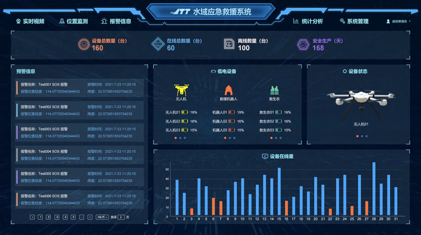 水域應(yīng)急救援系統(tǒng)采用C/S、B/S混合式、多層系統(tǒng)架構(gòu),將水域應(yīng)急救援系統(tǒng)(空中巡查系統(tǒng),水域救援系統(tǒng),作業(yè)平臺(tái)AI安全預(yù)警系統(tǒng),救援人員防溺水監(jiān)測系統(tǒng)等)、報(bào)警聯(lián)動(dòng)等全部融合形成統(tǒng)一的平臺(tái)系統(tǒng),滿足了水域的應(yīng)急救援需求,大大降低了系統(tǒng)使用難度、管理效率顯著提升。水域應(yīng)急救援系統(tǒng)前端救援設(shè)備包括水域AI攝像機(jī)、救援無人機(jī)、水上救援機(jī)器人、水上救援艇、智能定位報(bào)警救生衣、停機(jī)坪、太陽能充電板等,組成空中、水面立體化救援網(wǎng)絡(luò),應(yīng)對(duì)不同的水域救援場景需求。可廣泛應(yīng)用于抗洪救災(zāi)、海邊安全保障、水域管理、消防、交通指揮、邊防巡邏、應(yīng)急管理、部隊(duì)、大型保障等。