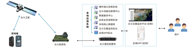 中心端軟硬件系統(tǒng)包括:1-北斗指揮機,2-北斗衛(wèi)星收發(fā)單元,3:本地應用系統(tǒng),4-北斗RDSS專用服務器,5-北斗監(jiān)控平臺與APP五大部分組成。