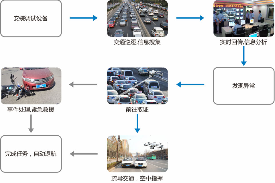 道路監(jiān)控、夜間巡邏、違章車輛監(jiān)控、拍照取證、交通疏導(dǎo)、空中喊話和空中指揮、緊急救護(hù)等。