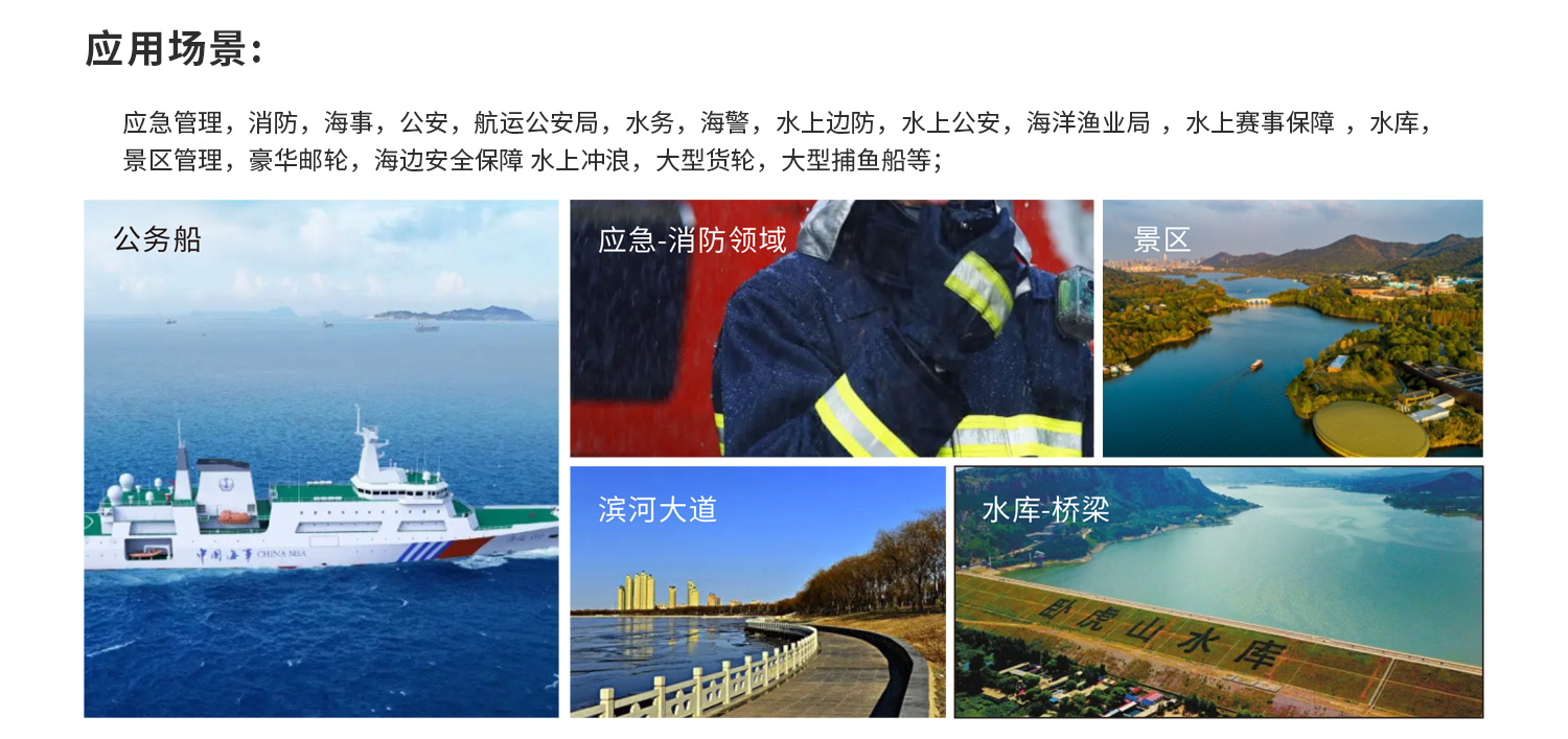 應用領域: 應急管理,消防,海事,公安,航運公安局,水務,海警,水上邊防,水上公安,海洋漁業(yè)局 ,水上賽事保障 ,水庫,景區(qū)管理,豪華郵輪,海邊安全保障 水上沖浪,大型貨輪,大型捕魚船等。