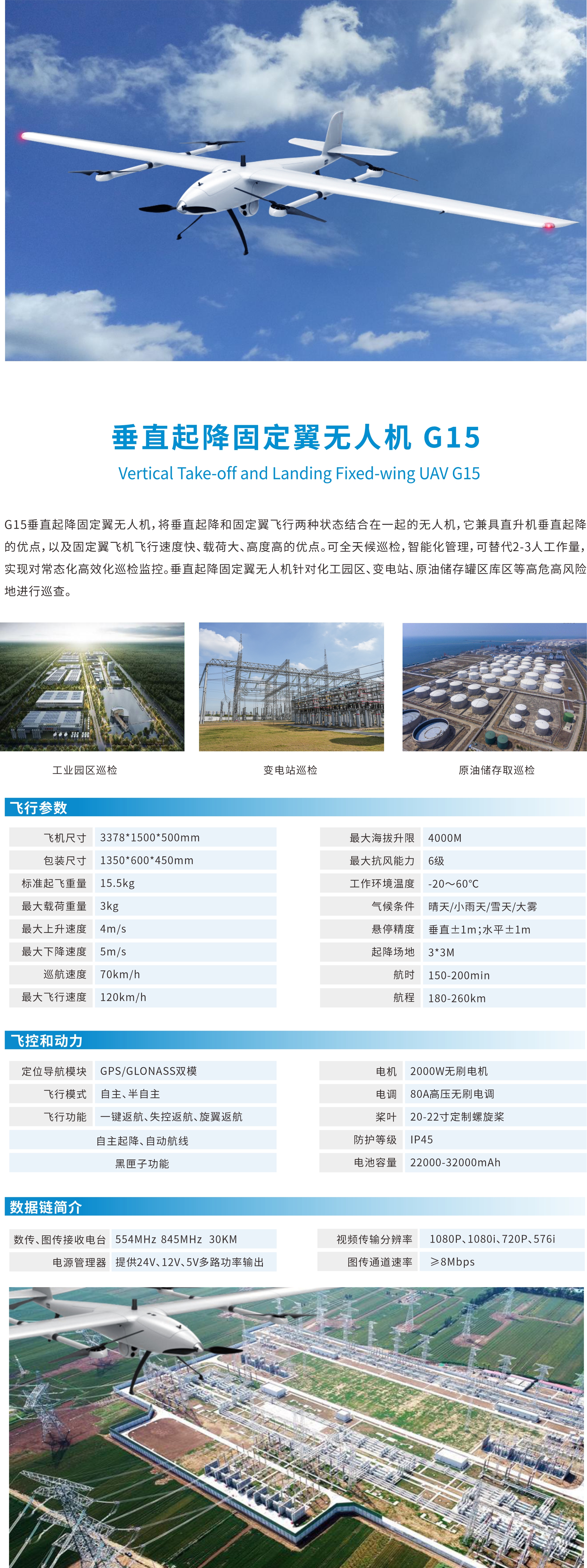 G15垂直起降固定翼無人機(jī),將垂直起降和固定翼飛行兩種狀態(tài)結(jié)合在一起的無人機(jī),它兼具直升機(jī)垂直起降的優(yōu)點(diǎn),以及固定翼飛機(jī)飛行速度快、載荷大、高度高的優(yōu)點(diǎn)??扇旌蜓矙z,智能化管理,可替代2-3人工作量,實(shí)現(xiàn)對(duì)常態(tài)化高效化巡檢監(jiān)控。垂直起隆固定翼無人機(jī)針對(duì)化工園區(qū)、變電站、原油儲(chǔ)存罐區(qū)庫區(qū)等高危高風(fēng)險(xiǎn)地進(jìn)行巡查。